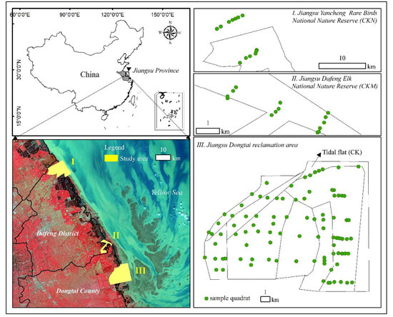 This study was mainly conducted in the central region of Yancheng Coastal Wetland, which is located in Dongtai County, Jiangsu Province, eastern China (120°45′–120°57′ E, 32°40′–32°52′ N). This area is situated in the coastal plain of the Yangtze River Delta, and its north and east borders are the south Yellow Sea (Figure 1). Jiangsu Province has the largest area of coastal wetlands in China [33]. Dongtai, adjacent to the largest alluvial coastal zone in the mid-latitude region, has a total land area of 3175.67 km2, and the reclamation area in Dongtai accounted for one-fifth of this area. The climate is affected by subtropical and marine monsoons with a mean annual temperature and precipitation of 14~15 °C and 1026~1051 mm, respectively. The Outline of Jiangsu Coastal Reclamation Development Plan has been implemented from 2009 to 2020 [34]. The planned area of cropland, ecological land, and construction land would account for 60%, 20%, and 20%, respectively. Figure 1. The land use and cover change of the study area has been analyzed, which can be seen from Xu et al. (2021) [18]. In a nutshell, the land-use types of the study area with the effect of reclamation activity in the past decades had gradually transformed from being dominated by natural types (e.g., tidal flat, halophytic vegetation) to artificial types (e.g., cropland, aquaculture pond, and construction land). The vegetation community along the coast of Jiangsu Province is successed with a certain pattern from the coast to inland [35]. Specifically, Spartina alterniflora dominates in the bare tidal flats, followed by Suaeda salsa, Phragmites australis, and other xeromorphic vegetation [35,36]. The core area of Jiangsu Yancheng Wetland Rare Birds National Nature Reserve (very low disturbance, close to zero disturbance) and the third core area of Dafeng Elk National Nature Reserve (low disturbance, mostly from elk) had been surveyed and regarded as a comparison with the natural wetland of Dongtai reclamation areas. The Dafeng Elk National Nature Reserve (120°47′–120°53′ E, 32°59′–33°03′ N) is located in the eastern part of Jiangsu province, near the Yellow Sea, and is the largest elk nature reserve worldwide with the largest number of wild elk populations [37]. Jiangsu Yancheng Wetland Rare Birds National Nature Reserve (119°80′–120°60′ E, 32°40′–34°80′ N), a Ramsar wetland in China, is the largest wintering area for the globally endangered red-crowned crane (Grus japonensis) and has the characteristics of a monsoon marine climate with the annual average precipitation of 980~1070 mm [38].