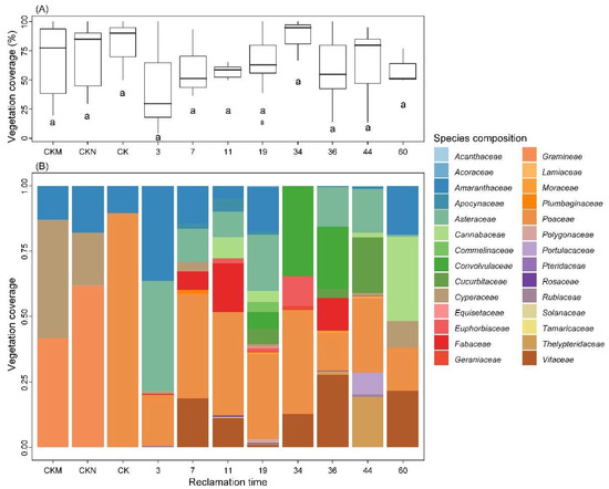 The species composition and coverage of the plant community along with reclamation time in the coastal area. The mean vegetation coverage of each subarea was the absolute value in (A), while it was the relative value in (B). The error bars at the upper and lower ends of each box represent the maximum and minimum values of the data, respectively, the upper and lower ends of the box represent the upper quartile and the lower quartile, and the horizontal line in the box represents the median value. Different lowercase letters mean a significant difference between CKM, CKN, CK, and the reclamation areas at the 0.05 level. The species composition in (B) represents the distribution of the family in each subarea. The exact value of the vegetation coverage of each family in different subareas can be found in Table S2 in the supplementary file.