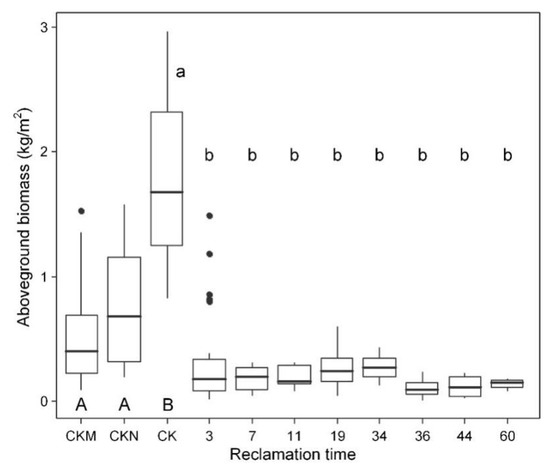 The aboveground biomass of the vegetation community greatly reduced after reclamation (p < 0.05), from 1.823 kg/m2 in the CK to 0.321kg/m2 in the three years of reclamation, and then maintained at 0.11~0.27 kg/m2 (Figure 3). There was no significant difference in the aboveground biomass between the reclamation areas with different reclamation years after reclamation (p > 0.05). There was no significant difference in aboveground biomass between CKM, CKN, and CK (p > 0.05).