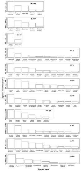 The species’ importance value. (A–K) respectively represents the important values of species in different plots. If the number of species that were recorded in the sample plot exceeds 10, only the top 10 species are displayed. If the number of species that were recorded in the sample plot is less than 10, all species are displayed.