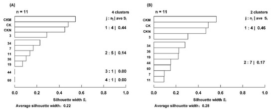 The optimal grouping scheme of each clustering method was obtained through the analysis of the Mantel correlation coefficient method. The results showed that the optimal grouping scheme of single linkage agglomerative clustering, complete linkage agglomerative clustering, UPGMA, and Ward was 4, 2, 2, and 2 groups, respectively. Based on the optimal grouping scheme, the clustering trees that were obtained by each clustering method were cut accordingly, and the results are shown in Figure 5. The grouping results of the above four clustering methods (i.e., two groups and four groups) were tested using a silhouette width plot (Figure 6). The average silhouette width value of the two groups and four groups were 0.28 and 0.22, respectively. Therefore, combining the cophenotype correlation coefficient that was calculated above in 2.3.2 and the silhouette width value, the UPGMA clustering should be selected as the final choice, which indicated that CKN, CKM, CK, and the three-year reclamation area were grouped, and the 7a, 11a, 19a, 34a, 36a, 44a, and 60a reclamation area were in the second group.