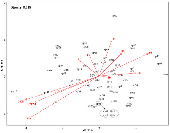 NMDS of vegetation that were based on the Bray–Curtis dissimilarity of important values. sp1: Suaeda salsa; sp2: Spartina alterniflora; sp3: Setaria viridis; sp4: Phragmites australis; sp5: Oplismenus undulatifolius; sp6: Sonchus wightianus; sp7: Erigeron canadensis; sp8: Cyclosorus parasiticus; sp9: Cayratia japonica; sp10: Eleusine indica; sp11: Ipomoea purpurea; sp12: Symphyotrichum subulatum; sp13: Cirsium arvense var. integrifolium; sp14: Tripolium pannonicum; sp15: Humulus scandens; sp16: Festuca elata; sp17: Salicornia europaea; sp18: Bolboschoenus planiculmis; sp19: Scirpus mariqueter; sp20: Achyranthes bidentata; sp21: Sesbania cannabina; sp22: Trichosanthes kirilowii; sp23: Cyperus difformis; sp24: Vicia sepium; sp25: Paederia cruddasiana; sp26: Chenopodium glaucum; sp27: Metaplexis japonica; sp28: Cynodon dactylon; sp29: Potentilla freyniana; sp30: Inula japonica; sp31: Equisetum ramosissimum; sp32: Helianthus tuberosus; sp33: Justicia procumbens; sp34: Acalypha australis; sp35: Echinochloa crusgalli var. mitis; sp36: Erigeron bonariensis; sp37: Euphorbia helioscopia; sp38: Euphorbia humifusa; sp39: Calamagrostis epigeios; sp40: Broussonetia papyrifera; sp41: Echinochloa colona; sp42: Panicum bisulcatum; sp43: Eclipta prostrata; sp44: Miscanthus sinensis; sp45: Alternanthera philoxeroides; sp46: Perilla frutescens var. purpurascens; sp47: Trifolium repens; sp48: Melilotus officinalis; sp49: Acorus calamus; sp50: Tamarix chinensis; sp51: Limonium bicolor; sp52: Amaranthus retroflexus; sp53: Commelina benghalensis; sp54: Polygonum perfoliatum; sp55: Bidens biternata; sp56: Capsicum annuum; sp57: Apocynum venetum; sp58: Portulaca oleracea; sp59: Polygonum lapathifolium var. salicifolium; sp60: Leptochloa chinensis; sp61: Solanum americanum; sp62: Eragrostis minor; sp63: Geranium carolinianum; sp64: Paspalum distichum; sp65: Vigna minima. The following is the same.