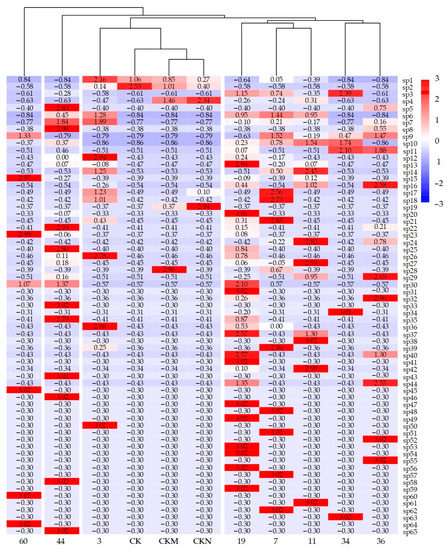 The representative species of the plant communities in the tidal flat reclamation area during the succession process of different years were further explored by using NMDS (Figure 7). At the same time, the relationship between the species and reclamation areas could be more clearly identified by showing the relationship between the species and reclamation areas in the form of a heatmap (Figure 8). The results showed that sp4 and sp19 were the typical species of CKN, while sp28 mainly appeared in CKM, sp2 was a typical species of CK. Sp50, sp12, sp36, sp26, and sp1 were mainly distributed in the three-year reclamation area. Sp48, sp51, sp57, sp62, sp39, sp17, sp18, and sp21 were mainly distributed in the seven-year reclamation area. Sp61, sp38, sp42, sp27, sp24, and sp14 were the representative species in the 11-year reclamation area. Sp31, sp41, sp47, sp49, sp53, sp54, sp56, sp59, sp20, sp13, and sp30 were mainly distributed in the 19-year reclamation area. Sp63, sp34, sp3, and sp11 were the typical species in the 34-year reclamation area. Sp52, sp55, sp32, sp29, sp16, and sp44 were mainly distributed in the 36-year reclamation area. Sp65, sp58, sp46, sp43, sp33, sp22, sp8, sp5, sp25, and sp35 were the representative species in the 44-year reclamation area. Sp64, sp60, sp45, sp23, and sp15 were mainly distributed in the 60-year reclamation area. The species succession process of plant communities in the coastal wetland ecosystem from sea to land under the influence of reclamation activities could be roughly summarized: Suaeda salina, Spartina alterniflora, Phragmites australis (CK) → Tamarix chinensis, Aster subulatus and Chenopodium glaucum, etc. (3-year reclamation area) → Calamagrostis epigeios, Salicornia europaea, Bolboschoenus planiculmis, and Sesbania cannabina, etc. (7-year reclamation area) → Euphorbia humifusa, Metaplexis japonica, and Tripolium pannonicum, etc. (11-year reclamation area) → Equisetum ramosissimum, Echinochloa colona, Trifolium repens, etc. (19-year reclamation area) → Geranium carolinianum, Acalypha australis, Setaria viridis, etc. (34-year reclamation area) → Amaranthus retroflexus, Bidens biternata, Helianthus tuberosus, etc. (36-year reclamation area) → Vigna minima, Portulaca oleracea, Perilla frutescens var. purpurascens, etc. (44-year reclamation area) → Paspalum distichum, Leptochloa chinensis, Alternanthera philoxeroides, etc. (60-year reclamation area). Combining the above cluster analysis results and further sorting out the succession process of the plant community, it could be seen that the plant community of the coastal wetland ecosystem under the influence of reclamation activities was first composed of salt-tolerant plants (such as Suaeda salsa, Spartina alterniflora, etc.), going through a species transition zone (a mesophytic plant community that was constructed with Setaria viridis, Eleusine indica, etc. as pioneer species), and finally succeeded to the xerophyte plant community that was dominated by Humulus scandens, Cyperus difformis, etc.