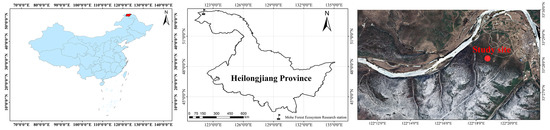 This study was conducted in Heilongjiang Mohe Forest Ecosystem Research station, which is located in the Daxing’an Mountains of northeast China (122°06′–122°27′ E, 53°17′–53°30′ N) (Figure 1). The area is in a continuous permafrost zone with a cold-temperate continental monsoon climate [30]. The average annual precipitation is 350–500 mm, mostly concentrating in July and August, with a frost-free period of 80–90 days. The average annual temperature is −4.9 °C, with a minimum temperature of −52.3 °C and a maximum of 33 °C. The zonal vegetation in the area is a bright coniferous forest dominated by larch forest (Larix gmelinii) with scattered camphor pine (Pinus sylvestris var. mongolica) forest and white birch (Betula platyphylla) forest. The forest ecosystem in this area is relatively simple in structure with limited plant species. The zonal soil of the area is brown coniferous forest soil and a sparsity of meadow soil and swampy soil [31], with a soil pH between 4.4 and 5.4 and a soil thickness of approximately 30 cm.