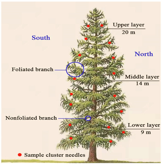 Three typical larch-forest plots were selected within the radiation range of the flux tower (Table 1), with each plot size of 20 m × 30 m. When selecting plots, we ensured that the differences in slope and slope direction were minimal to eliminate the topographic factor influence on WUEs. The diameter at breast height (DBH) and tree height (H) were measured for each tree whose DBH was greater than 5 cm in each plot, and the average DBH and H for three plots were calculated independently. Then, three sample trees with DBH values respectively similar to the average DBH and H of the three plots were selected to represent the average state of each plot. The canopy of the sample tree was evenly divided into three parts (upper canopy 20 m, middle canopy 14 m and lower canopy 9 m) based on the top-down pseudowheel [32] in the crown, the center part of each canopy was sampled (Figure 2). The analysis of our previous work showed that there were no significant differences in carbon isotopes between negative and anophytic leaves in four directions: the southeast and northwest directions of each canopy, and the needles in the middle part of each canopy represent the average standard for each canopy WUEs.