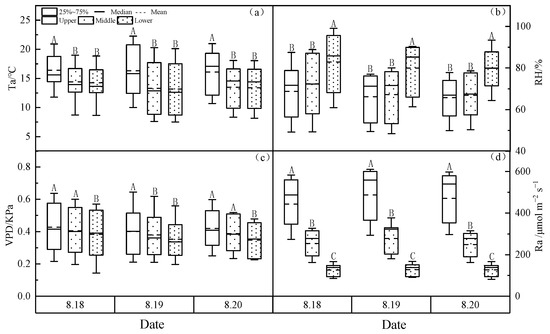 (a) Air temperature (Ta), (b) relative humidity (RH), (c) vapor pressure deficit (VPD) and (d) photosynthetically active radiation (PAR)at different heights of the larch-forest canopy. Notes: Capital letters represent significance at different canopies at 0.01 level.