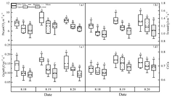 (a) Net photosynthetic rate (Pn), (b) transpiration rate (Tr), (c) stomatal conductivity (Gs) and (d) intercellular and atmospheric CO2 concentration ratio (Ci/Ca) change at the different canopy heights of the larch forest. Notes: Capital letters represent significance at different canopies at 0.01 level.