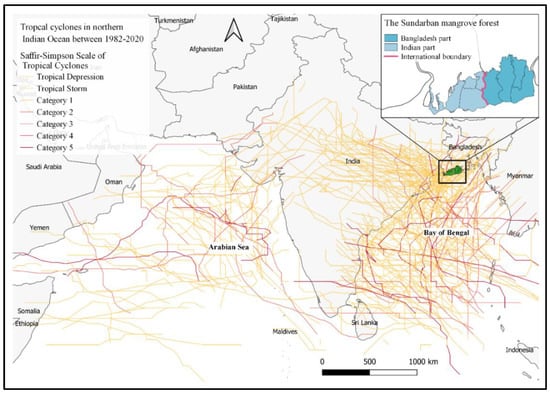 Number of tropical cyclones observed since 1982 over the northern Indian Ocean. The Sundarbans area is represented by thick black inset box. Best track data of tropical cyclones were obtained from India Meteorological Department [12]. Base map: UIA World Countries Boundaries [29].