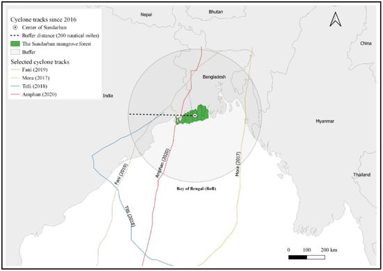 Data on major cyclones that formed in the Northern India (NI) basin since 1982 were retrieved from the India Meteorological Department (IMD) [12] (Figure 1). Cyclones that impacted the Sundarbans or made landfall there since 2016 (i.e., a centroid point: 21°56′21.31″ N, 89°10′56.01″ E) within a radius of 370.4 km (200 nautical miles) were cataloged according to the methodology described in Mandal and Hosaka [2], with adjustments due to image availability. As multiple cyclones impacted the Sundarbans, only the strongest were selected each year. As a result, cyclones Mora in 2017, Titli in 2018, Fani in 2019 and Amphan in 2020 were identified as our focal storms (Figure 2). The India Meteorological Department (IMD) uses a slightly elaborated categorization of cyclones based on estimated maximum sustained wind speed (km h−1; hereafter “wind speed”), but for comparison, the SSHWS was used for categorization (hereafter “category”). Minimum distance (km; hereafter “distance”) of cyclone eye wall track from the center of the Sundarbans was determined. Study-selected cyclones along with those identified previously by Mandal and Hosaka [2], as well as specific cyclone-defining parameters, are presented (Table 1).