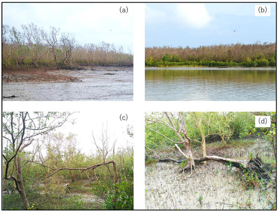 Impacts of the Super Cyclone Amphan on Sundarbans mangrove areas of India, depicting: (a) Defoliation of mangroves near the shore (representative of wide areas), (b) Coastline mangrove canopy turned to reddish brown (representative of wide areas), as well as examples of (c) a broken mangrove stem with resultant canopy gap and coarse woody debris and (d) an uprooted tree of Avicennia marina under muddy conditions.