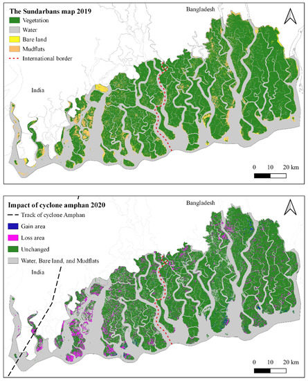 Impacts of Super Cyclone Amphan on the Sundarbans mangrove forest vegetation. Top panel illustrates the classified map of Sundarbans area in 2019. Bottom panel illustrates the track of Super Cyclone Amphan in May 2020 [12], and the distributions of unchanged vegetation (green color). Lost (pink color) and gained (dark blue) areas from Amphan are based on NDVI.