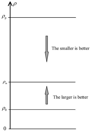 The previous description in Section 2 suggests that a larger is not necessarily better, nor is a smaller . A suitable carrying status of land resources should be set, the fundamental purpose of which is to ensure a balance between the carrying capacity of land resources and the pressure exerted by human activities, in order to realize the sustainable use of land resources. In regions with relatively high socio-economic development, is generally high because of the relatively large consumption of or damage to land resources, and they should maintain at a relatively low carrying status. In other words, it is better to have a lower in these regions, but there should be a lower limit because a value that is too low means the ineffective use and waste of land resources. On the other hand, in regions with relatively lagging socio-economic development, is generally low, and they should pursue socio-economic development. In other words, it is better to have a higher in these regions, but there should be an upper limit to avoid irreversible damage to land resources. The discussion above is represented in Figure 2.