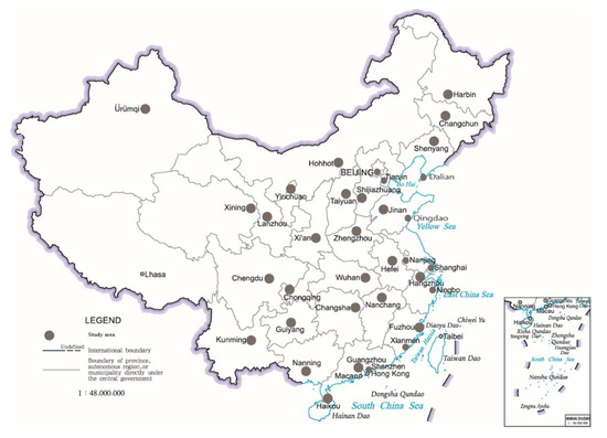 Spatial distribution in 35 major cities. Source: Redrawn by the author from http://bzdt.ch.mnr.gov.cn/, accessed on 20 October 2021.