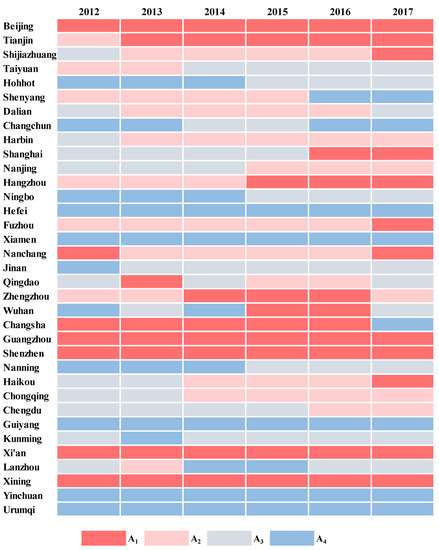By using the results in Table 2 and the interval classification criteria (–) mentioned above, the temporal evolution of the LRCC for the 35 major cities in 2012–2017 was determined, as shown in Figure 4.