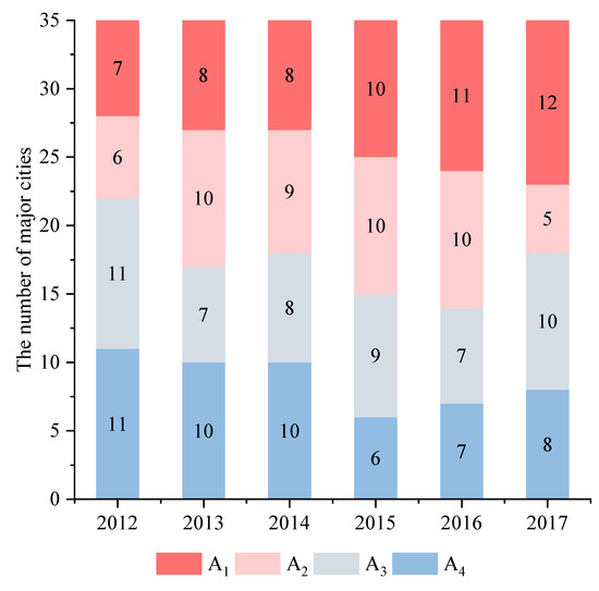 As can be seen in Figure 5, the number of cities in the four different LRCC performance intervals changed significantly over the period 2012–2017. Specifically, the number of cities in the A1 and A3 intervals increased, while that in the A4 interval decreased. This indicates that the intensity of land loads on land carriers increased between 2012 and 2017 in 35 major cities in China. This may be attributed to China’s strong efforts in recent years to promote economical and intensive land use, which have increased the level of utilization of land resource carriers. For example, Notice on Strict Enforcement of Land Use Standards to Vigorously Promote Land Saving and Intensive Land Use [40], issued by the Ministry of Land and Resources (now renamed the Ministry of Natural Resources) in 2012, stated that localities should strictly follow the various land policies issued by the State and resolutely implement the control targets for construction land for highways, railways, civil aviation transport airports, electric power, and coal, oil, and gas projects, among others. In addition, the sizes of land lots and floor area ratio standards for real estate land should be controlled. These initiatives have been proven to enhance the carrying capacity of urban construction land for socio-economic activities [41].