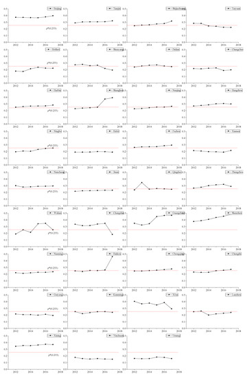 Figure 4 also shows that the variations in the values of LRCC exhibit significant variability among cities. To illustrate these changes, the results in Table 2 are plotted as graphs to show the evolution of LRCC values in individual cities (see Figure 6). In Figure 6, the red line, which indicates = 0.253, acts as a reference to observe if the values of LRCC are reasonable or not.