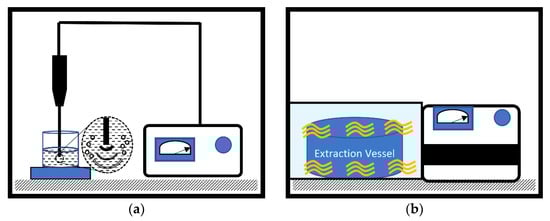 Ultrasound-assisted extraction is considered to be a novel extraction technique with low solvent requirements, environmental friendly, easy handling and fast extraction rate [65,66]. It can be used in combination with other non-conventional extraction techniques such as microwave-assisted extraction [67,68]. A UAE workflow schematic diagram is shown in Figure 3a. It consists of a sonicator probe, extraction vessel and ultra-sonicator generator. The efficiency of the UAE method is based on various factors such as the temperature, extraction time, ultrasound power, solid to solvent ratio and the biomass characteristic. Youssouf et al., 2017 investigated alginate extraction from Sargassum binderi and Turbinaria ornate with the addition of ultrasound treatment at various different pH, solid loading ratio and extraction time [42]. Under the optimum condition (pH 12 using Na2CO3, loading ratio of 1:100, 40 min with ultrasound at 25 kHz, 150 W), the alginate extraction yield reached 54.06%. However, the experimental data showed that extraction process is very sensitive to pH, as discussed before. The ultrasound generates physical forces such as shear, acoustic streaming, microjets, leading to disperse of the cell wall, reduction in particle size and good contact between solvent and target compounds [69].
