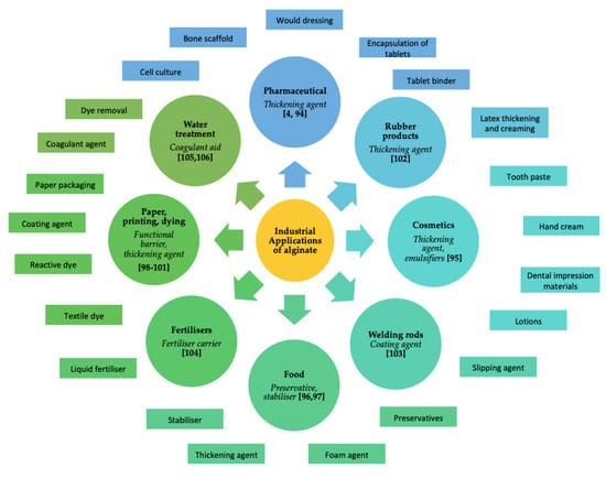 Schematic diagram of industrial application of alginate [4,94,95,96,97,98,99,100,101,102,103,104,105,106].