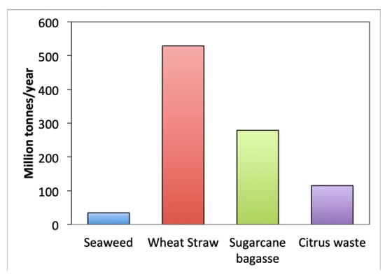 The growing popularity of alginate usage in various industries has accelerated the production of alginate worldwide. The sustainability of seaweed cultivation and its potential to produce bioethanol, biomethane, biofertilizer and other value-added products have been intensively investigated using life cycle assessment method [107,108,109]. The benefits of a seaweed based biorefining process on the carbon dioxide remediation, fossil fuel replacement, marine eutrophication deduction and acidification reduction have been widely recognized. However, to secure future sustainability in the seaweed industry, it is required to improve seaweed disease control and to increase conservation of genetic diversity in wild seaweed to screen out or to genetically design promising new varieties [110,111]. Another challenge of using seaweed as a feedstock for bioprocessing is the relatively low annual output of the seaweed. The annual seaweed production of 34.5 million tonnes is low in comparison to other potential biomass resources, such as wheat straw (529 million tonnes) [112], sugarcane bagasse (279 million tonnes) [113] and citric waste (110–120 million tonnes) [114], as shown in (Figure 5). It suggests that improving aquaculture of seaweed should be supported.