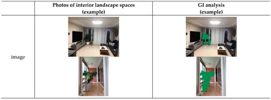 Photos were taken based on the GI measurement method [,,]. As for the measurement method, first, position was established in a location where the space for growing plants can be seen at a glance and second, photos were taken by adjusting the downward angle within 20° from the line of sight at a height of 1.5 m such that the plants placed at the bottom could be seen. If the target spaces could not be clearly seen due to the space structure, the participants were asked to shoot the spaces twice from different angles.