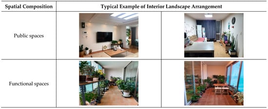 Accordingly, this study classified the types of houses into detached and multi-unit dwellings and residential spaces into public, private, and functional spaces. Housing types and spatial compositions were considered in the interior landscape analysis.