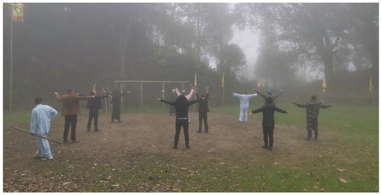 Inspired by this tradition, the program was named as ‘the hermit master’. To protect and promote this tradition, each guesthouse was named after the titles of well-known martial arts novels by Louis Cha, new plum blossom piles for training the steps were set up (Figure 3), a museum to showcase the martial arts history, techniques and masters was built (Figure 3), and the daily morning practice was organised (Figure 4).