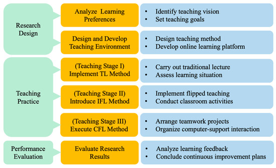 The case study results reported by Ng and Nicholas [25] show that students who follow a progressive instructional learning model can consistently complete all the required tasks of an online learning program. Although the effects of cooperative learning on classroom interactions have been studied [23,26,27], few studies have focused on students’ perspectives, specifically after they sequentially engage in several different learning methods [25]. Therefore, this study divides the one-semester course into three parts and adopts three different learning methods, from TL to IFL and then CFL, to increase the diversity of learning styles.