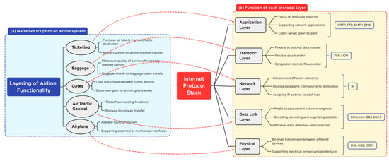An example of student notes in Teaching Stage II: Using (a) a narrative script for an airline system to illustrate (b) the function of each layer of the Internet protocol stack.