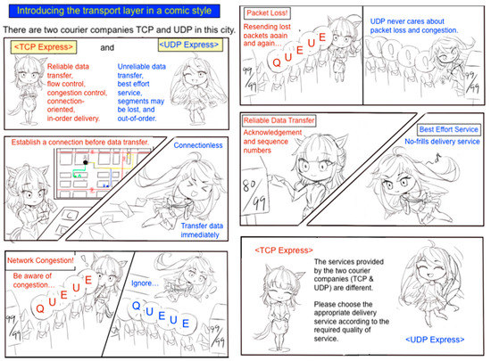 An example of student teamwork results is illustrated in Figure 4. The presentations were based on the transport layer of Internet protocol suite. The students adopted an anthropomorphic approach in transforming the TCP and user datagram protocol (UDP) into virtual characters and attempted to distinguish TCP and UDP from the perspective of reliable data transfer. Students used a comic style to represent TCP and UDP through the characteristics of two courier companies. Then, they used these two courier characters to make a comic strip. They compared the processing mechanisms of the two courier companies in connection establishment, network congestion, packet loss, and reliable data transmission to connect the comics with the course content. Students were very proud of their collaborative model, with some members analyzing course content, some scripting, and others creating comics. Feedback from students on group work indicated that they were very immersed in teamwork and found the activity had the effect of increasing interest and motivation in learning.