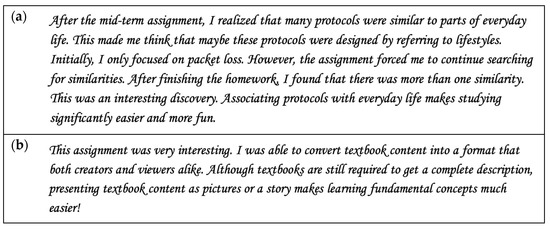 The learning experiences of two students in Teaching Stage II are illustrated in Figure 5. In Figure 5a, the student expressed that the learning-by-doing activities helped him connect theory with everyday life. The assignments encouraged deeper contemplation, allowing him to find practical examples for the application of theories taught in the course. Another student compared the learning-by-doing activities with traditional assignments and expressed his learning experience in Figure 5b. He agreed that the graphical representation of theoretical transformations helped him better understand the course content. He said that the classroom activities required students to understand the content and communicate the content to others. This process helped him understand the content more deeply than TL.