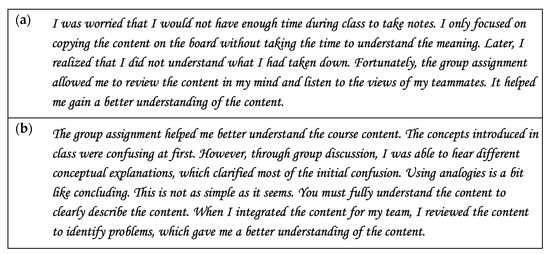 The learning experiences of students in Teaching Stage III are illustrated in Figure 6. A student shared that, as shown in Figure 6a, in TL mode, he only concentrated on the completeness of his notes instead of understanding the content of the class. However, after participating in the group work, he can review the content in more detail and listen to the opinions of other classmates. He said that group activities improved his academic performance. Another student shared, as shown in Figure 6b, saying that in traditional face-to-face lectures, he did not completely understand the concepts taught in class. After participating in the group work and discussing the content with his teammates, he was able to better understand the content of the course. He also expressed that giving examples helped him understand the content better and that teamwork is helpful for learning.