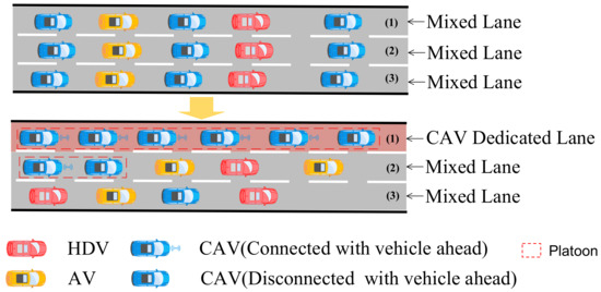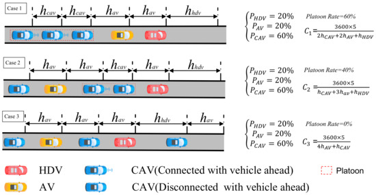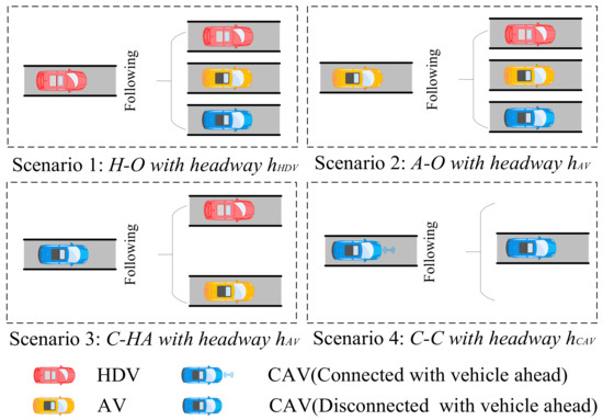 - Traffic flow composition: Although there are two types of autonomous driving technologies, that is, AVs and CAVs, the micro behaviors of vehicles (including car following, lane changing, and CAV platooning) of different brands and technical levels (L1–L5) [38] are bound to be different. We simplified MTFs into three categories: HDVs, AVs, and CAVs. When a CAV follows an HDV or an AV, and there is no real-time interaction with the vehicle in front based on the internet-connected communication function, the CAVs degrade to AVs [14,24]. Section 2.2 provides details on those specific analyses.