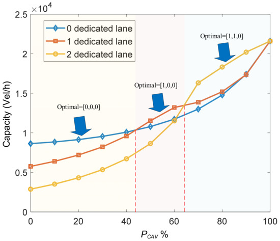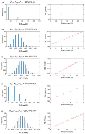 - In the future, traffic flow is expected to comprise HDVs, AVs, and CAVs simultaneously, and the capacity of mixture flow is expected to be quite complex (which can be affected by the MPRs of AVs and CAVs in MTF, saturation headway in multiple vehicle-following scenarios, and platooning rates of CAVs). Additionally, the capacity is convex to the MPRs of AVs and CAVs, which indicates that the growth in capacity is not linear (AVs and CAVs have a “scale effect” on capacity growth). In other words, the population of AVs and CAVs does not necessarily lead to a rapid increase in capacity when the MPR is >40%; therefore, the long-term operating efficiency of existing urban transportation facilities can be improved significantly.