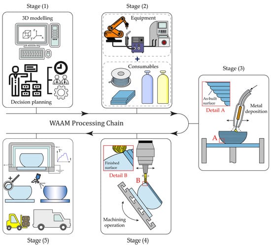 Flow map of a typical WAAM processing chain composed by five main stages.