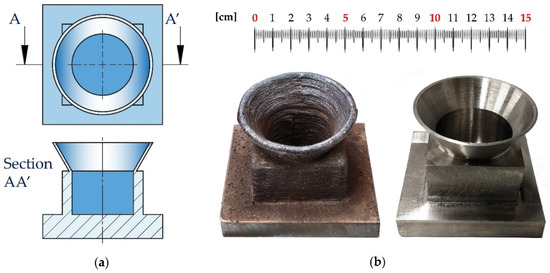 Case study part used for assessing the performance of the process-based cost model (PBCM). (a) Schematic representations on the top and front sectioned views of the part. (b) Case study part after deposition (left-side) and after machining (right-side).