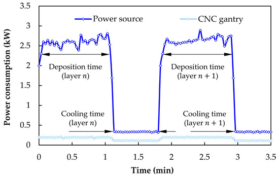 Experimental measurements of power consumptions (kW) from the gas metal arc welding power source (dark blue) and CNC gantry (light blue) during metal deposition by WAAM of two layers (layer “n” and layer “n + 1”).