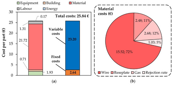 Figure 4b provides a deeper analysis on material costs showing that the wire feedstock contains a big portion (72%) of the overall material costs. The remaining costs spent on the baseplate and shielding gas are somewhat leveled, constituting percentages of 12% and 11% of the total material costs. These results are mainly related with the higher acquisition cost of the material in a wire format. Conversely, labor and energy costs are low due to the high automatization degree and high deposition rates of WAAM (low worker dedication and fast processing cycles) while equipment costs reflect upon the low acquisition expenses of flexible systems that integrate a welding power source with a CNC gantry.