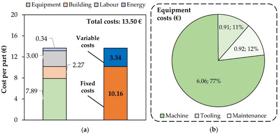 Cost performance of machining stages in a WAAM processing chain. (a) Presentation of the individual and total production costs per part. (b) Presentation of the individual production costs per part related only to equipment costs.