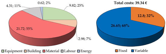 The remaining two terms involved in the fixed costs (refer to Equation (2)) are related to building use and administration overheads. Building use expenses are estimated as a function of the yearly rent rate (YRR, €/m2), the machinery area (MA, m2) and the utilization rate (UR),