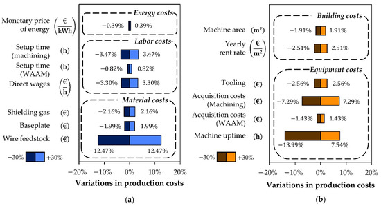 Results are presented in Figure 7a for variable costs and Figure 7b for fixed costs. Variations in unit energy and labor costs show small fluctuations in the production costs, whereby the main cost driver is the setup time in machining tasks (maximum variation of ±3.47%). Still, this result highlights that setup times in machining have a greater impact in production costs than the same setup types but for metal deposition tasks (approximately 4 times higher fluctuations). As expected, the acquisition of the wire feedstock is the main cost drivers in a WAAM processing chain (maximum obtained variation of ±12.47%), clearly surpassing those spent in baseplate and shielding gas consumptions.