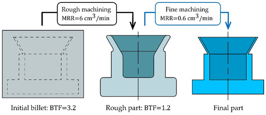 Schematic representation of a traditional subtractive approach to obtain the case study part through rough and fine machining tasks. The assumed Buy-to-Fly ratios (BTF) and material removal rate (MRR) for each task are enclosed as well.