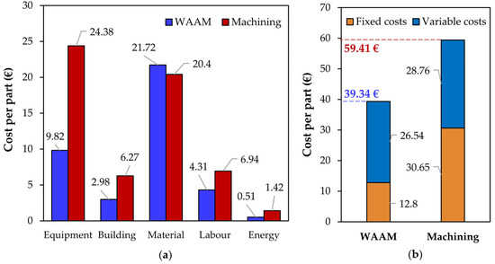 Comparison of costs per part between a wire-arc additive manufacturing processing chain (WAAM) and a traditional subtractive approach (machining). (a) Individual costs. (b) Total costs.