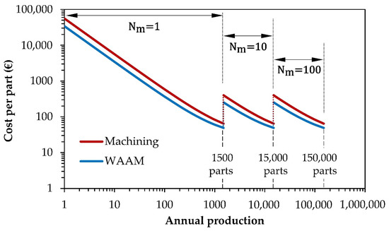 For cases where the annual production is higher than 1500 parts, more machines have to be implemented because otherwise the production times would exceed the available machine uptime. Hence, the following cost analysis disclosed in Figure 10 considers the existence of either 1, 10 or 100 fully-dedicated machine sets . This new variable serve as a multiplication factor to all fixed costs of the PBCM. For WAAM, a machine set implies the utilization of one WAAM system (power source + CNC gantry) and one machining center. For the traditional subtractive approach, the same machine set now suggests the existence of two machining center: one for rough machining stages and another for fine machining stages.