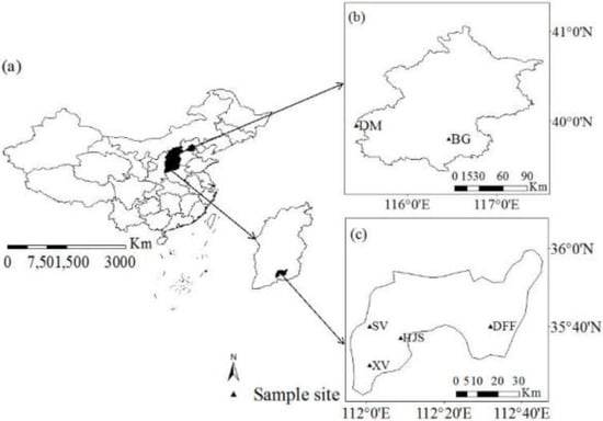 The location of the study sites in Shanxi and Beijing of China. Abbreviations: Dongling Mountain (DM), Botanical Garden (BG), Shuiquan Village (SV), Xiachuan Village (XV), Haojiashan (HJS) and Duanshi Forest Farm (DFF). (a) China, (b) Beijing, (c) Shanxi.
