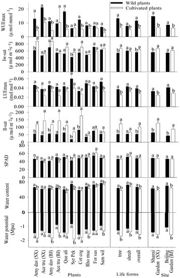 Relative chlorophyll content (SPAD), leaf water content (LWC), leaf water potential (φ), maximum light energy use efficiency (LUEmax), maximum water use efficiency (WUEmax) and their corresponding saturated light intensity (Il-sat, Iw-sat) of wild and cultivated plants (Mean [SE], n = 3), and plants in life forms (tree: wild plants n = 18, cultivated plants n = 12; shrub: wild plants n = 12, cultivated plants n = 12; overall: wild plants n = 30, cultivated plants n = 24) and in sites (each bar with 5 species, three replicates for each species. n = 15). Bars with different lowercase letters are significantly different between wild and cultivated plants (p < 0.05). Amy dav (SX), Amy dav (BJ), Ace tru (SX) and Ace tru (BJ) represent Amygdalus davidiana in Shanxi and Beijing, Acer truncatum in Shanxi and Beijing, respectively. Plant abbreviations are shown in Table S1.