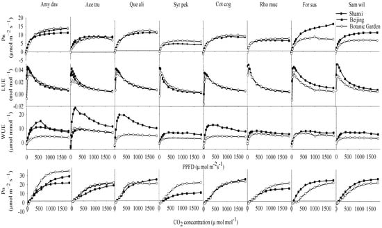 The CO2 response curve was lower in the natural sites than in the botanical gardens for A. davidiana, A. truncatum, S. pekinensis and R. mucronulatum; it was higher in the natural sites than in the botanical gardens for F. suspensa and S. williamsii; and it was lower in the natural sites than in the botanical gardens for Q. aliena and C. coggygria at low CO2 concentrations and higher at high CO2 concentrations. The LUE curves were higher in the natural sites than in the botanical gardens for F. suspensa and S. williamsii; they were higher in the natural sites than in the botanical gardens for A. davidiana, A. truncatum, Q. aliena var. Acutiserrata, S. pekinensis, C. coggygria and R. mucronulatum under low light intensity and were similar under high light intensity. The WUE curves were higher in the natural sites than in the botanical gardens for all plants (Figure 3).