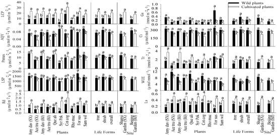 The photosynthetic parameters of wild and cultivated plants, and plants in life forms and in sites. Bars with different lowercase letters are significantly different between wild and cultivated plants (p < 0.05). Other description is same as Figure 2.