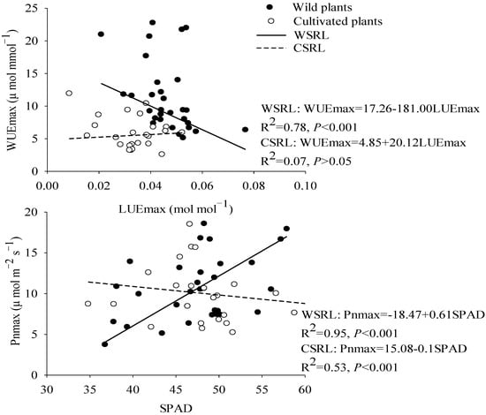 Relationship between net photosynthetic rate at light saturation (Pnmax) and SPAD value, LUEmax and WUEmax. Abbreviations: wild plants regression line (WSRL), cultivated plants regression line (CSRL).