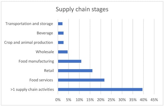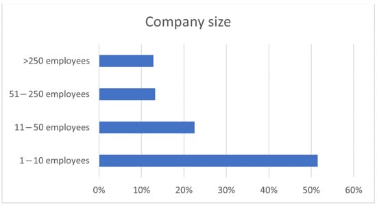 The sample included companies that belong to several food industry sub-sectors, covering the entire food supply chain network and ensuring that the findings do not relate only to specific supply chain members. Of the companies involved, 39.5% of the firms participate in more than one supply chain activities and 21.7% operate in the food services sub-sector; 16.1% operate in the retail sector and 10.9% in food manufacturing. The rest of the companies operate in other sub-sectors such as wholesale (4.5%), crop and animal production (2.6%), beverage industry (2.6%), and transportation and storage (2.1%) (Figure 1). Regarding the size, based on the number of employees, the responding companies were grouped as follows: 51.5% were very small enterprises (1–10 employees), 22.5% small enterprises (11–50 employees), 13.2% medium enterprises (51–250 employees), and 12.8%were large enterprises (>250 employees) (Figure 2).