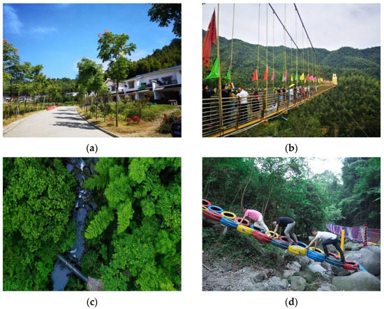 Selected photographs of Tianxi village: (a) Folk houses; (b) the glass bridge; (c) aerial view of attractions; (d) tourists in action (images from: http://www.ddcpc.cn/fp/201909/t20190925_618540.shtml (accessed on 16 November 2021); https://www.icswb.com/h/158/20200720/667562.html (accessed on 16 November 2021)).